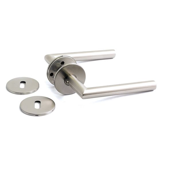 Art.nr: 4065500Dørhåndtak i børstet rustfritt stål, beregnet for innerdører. Skjult feste av rosett og nøkkelskilt.