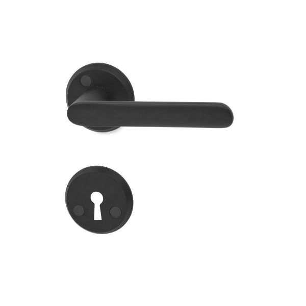 Solid innerdørshåndtak i messing eller zamak (svart) med overflate i børstet krom. Inkludert nøkkelskilt.