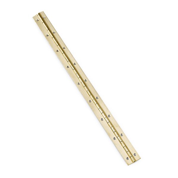 Pianohengsel i rustfritt stål med rustfri bolt eller messing med bolt av messing. Godstykkelse for rustfritt stål 0,7 mm og for messing 0,8 mm.
