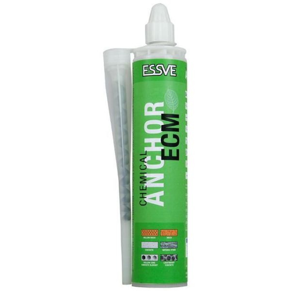 ESSVE ECM er en ankermasse på 300 ml for sterk og sikker innfesting av pinnebolt, gjengestang eller armeringsjern i massive og porøse materialer som betong, naturstein, tegl, hullsteinsmaterialer, lettklinker og lettbetong.