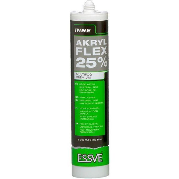 ESSVE Flex 25% er en listhvit høyelastisk akrylfugemasse på 300ml for innendørs bruk. Flex 25% er beregnet for fuger med krav til høyt bevegelsesopptak i tørre og frostfrie miljøer. Fugemassen kan også brukes utendørs forutsatt at det skjer i frostfrie og regnbeskyttede omgivelser de første 60 minuttene. Kan oppbevares i kuldegrader ned til –10 °C i kortere tid. Eventuelt søl rengjøres med vanlig vann og en fuktig klut.