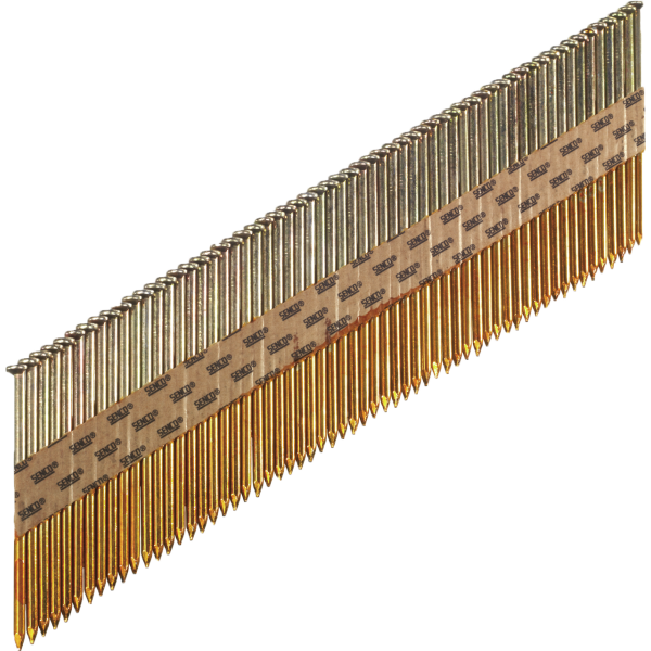 Stavbåndet spiker 3,1x90 mm med 34° vinkel, glatt stamme, diamantspiss og Sencos typegodkjente Sencote-lim. Spikeren er blankforsinket, noe som gjør den egnet for beskyttede miljøer/innendørs bruk med lav korrosjonsbelastning.