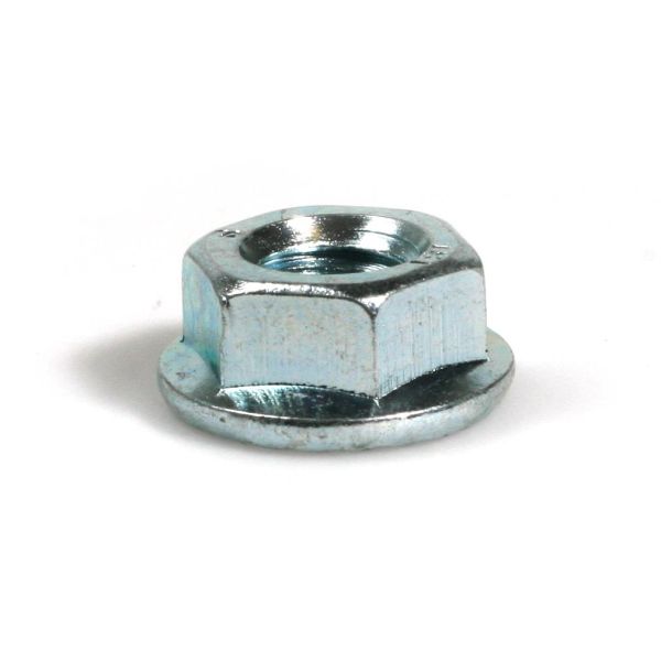 Art.nr: 3011198M-gjenge. Sekskantmutter med flens med låsetenner (rillet) i henhold til DIN 6923 (ISO 4161).