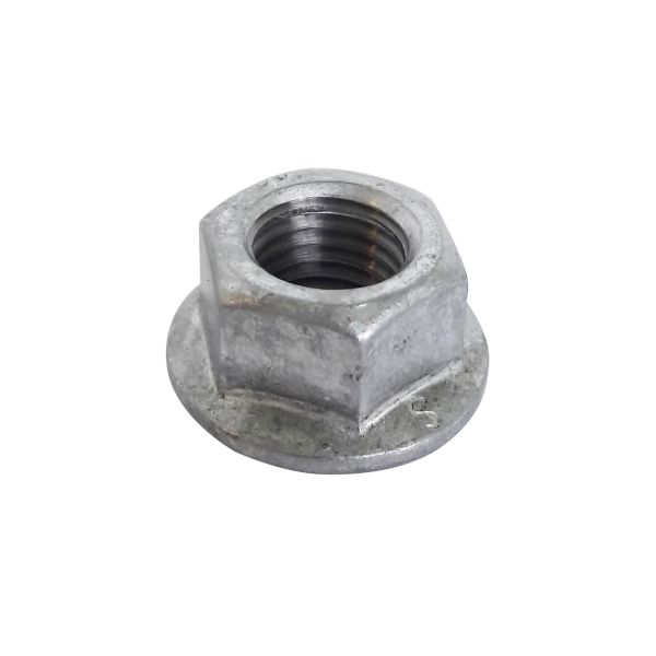 M-gjenge. Sekskantmutter med flens uten låsemekanisme i henhold til DIN 6923 (ISO 4161). Stål klasse 8.0 varmegalvanisert. Uten låsemekanisme (plan)