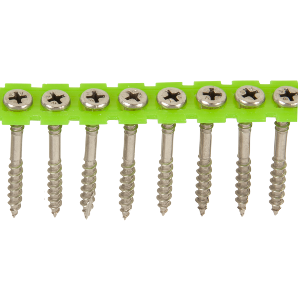 Skruen er produsert i rustfritt syrefast stål A4 for svært utsatte miljøer, for eksempel fasader av eksklusive treslag, varmebehandlede treslag, fasader med korrosiv overflatebehandling som jernvitriol og fasader ved kysten. Rustfri skrue er også å foretrekke i fasader siden vær og vind genererer bevegelser der uherdet skrue er det beste valget. Skruen er utstyrt med et fiberskjær i spissen for å redusere sprekkdannelse og redusere iskruingsmoment. Det forsenkede hodet med tetningskant under gir en god forsenkning og forseglet hullet for ikke å slippe inn væte innenfor overflatebehandlingen. Skruen er utstyrt med PH-feste/bits. Anbefalt turtall er maks. 2000 o/min.