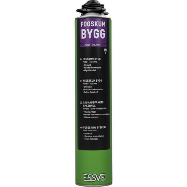 ESSVE Bygg er et allround, hurtigherdende pistolskum for året rundt bruk. Noe elastisk lettfikserende, med svært gode isolerende og lyddempende egenskaper. Kan skjæres og overmales etter herding. Tåler ikke sollys, skal dekkes/overmales.