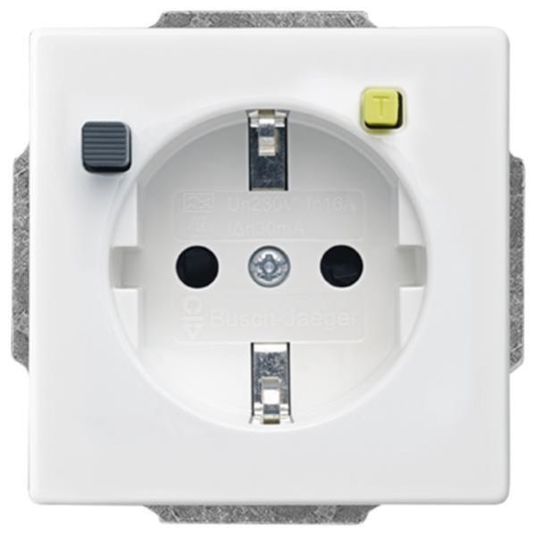 1-veis jordet vegguttak med jordfeilbryter for innfelt montering. Uttaket er forsynt med svart knapp for til- og fraslag og en gul knapp for test. Inkl. Imressivo hvit midtplate. Suppler med løs ramme Impressivo, Accent eller Carat