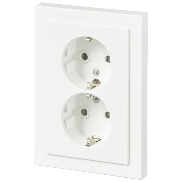 Stikkontakt i Impressivo design. Installert i 1.5 enhetsboks. Stikkontakten er ekstra sikker da den har verneskjerm (barnebeskyttelse) og jording integrert i innsatsen. Den unike løsningen gjør stikkontakten trygg selv uten beskyttelsesdeksel, noe som er spesielt bra i offentlige miljøer som skoler, forsamlingshus og idrettshaller, hvor det er stor risiko for at stikkontaktenes beskyttelsesdeksler kan bli skadet. Løsningen er også god for hjemmemiljøer, som oppussing og tapetsering. Materialet i hetten er fargefast. Hver fase har fire vinklede forbindelser som letter tilkoblingen.
