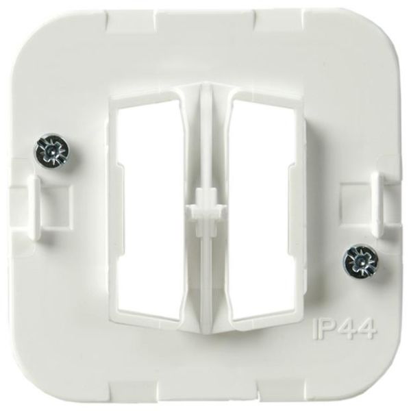 Skruefestingsramme for vipper. Brukes sammen med strømstillerinnsatser ved IP44-montering sammen med tetningsdamask 2463 eller 2464. Brukes uten tetningsdamask når dekkrammene av sikkerhetsgrunner må være fastskrudde.