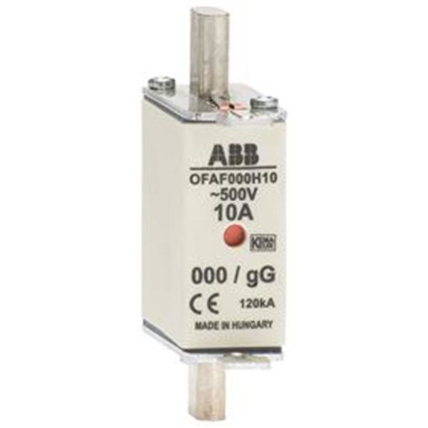 ABB knivsikringer er av sikringstype NH000 i henhold til IEC 60269 og har driftskategori gG, som innebærer en utløsningsegenskap tilsvarende trege sikringer. De er beregnet for bruk i både AC- og DC-anlegg opptil 500 V og har merkestrøm 10 A. Sikringene har verken smeltesikringsindikator eller isolerte metallgrep, og effekttapet ved merkestrøm er 1,1 W.