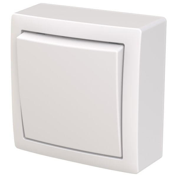 Utenpåliggende trappebryter SAGA. De skrueløse terminalene er for maksimalt to solide eller stive ledninger. Inkludert bryterinnsats, vippe, overflatemonteringsramme og bunn. Biosirkulær plast brukes i bunn- og midtplaten.