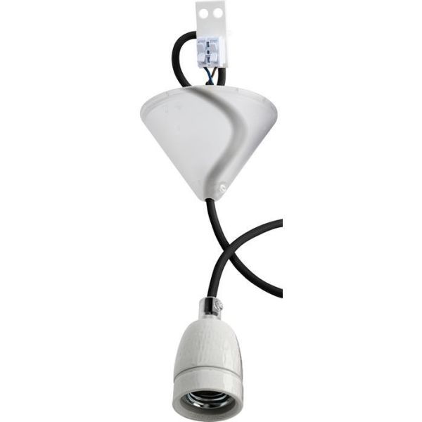 Lampeoppheng med hvit tekstilkabel, lampeholder i porselen, ledningsforkorter, hurtigkobling og transparent takdeksel med sideskrue.