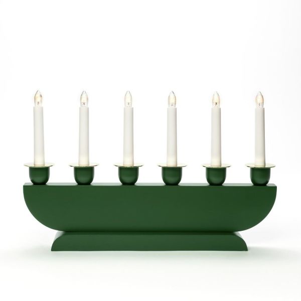 Konstsmide 3989-980 er en elektrisk lysestake med 6 lyspunkter, laget av tre i mørkegrønn med messingdekorasjon 230V/IP20.
