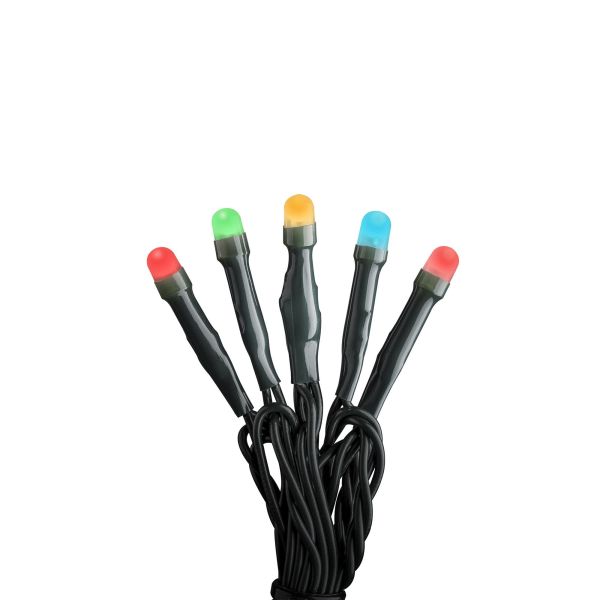 Konstsmide 6344-520 er en lysslynge med 100 fargede lysdioder, frosttopp og mørkegrønn kabel. 30V/IP20.