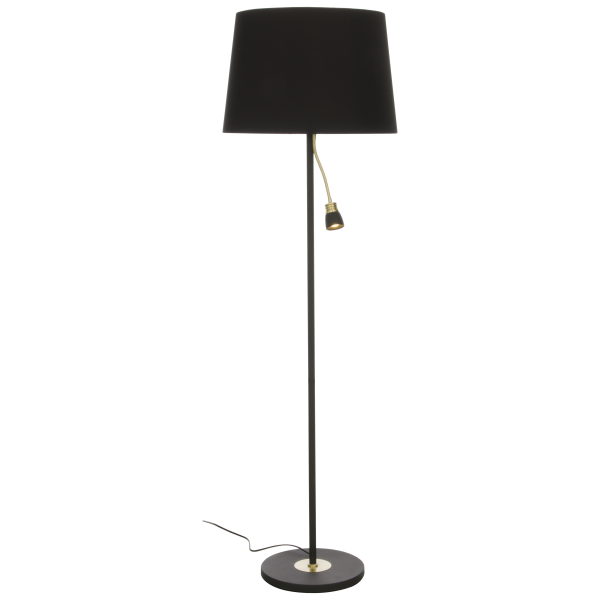 Aneta Lighting Eketorp er en gulvlampe i svartlakert metall med detaljer i matt messing og svart tekstilskjerm. Lampen har en justerbar arm med integrert 5 W LED-lyskilde som gir behagelig, varmt hvitt lys. Maks 60 W E27 for tekstilskjermen, lyskilde medfølger ikke. Separate brytere på lampen.