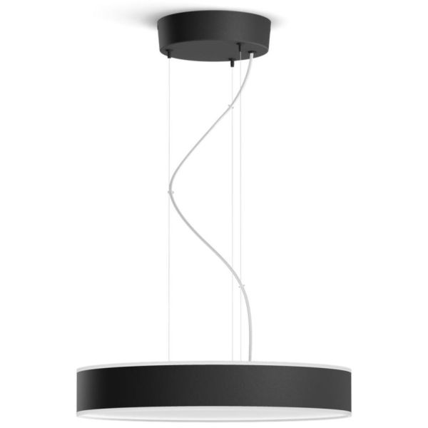 Philips Hue Enrave 915005998101 Pendel. Philips Hue Enrave er en pendelarmatur med bred lysvinkel og en unik, moderne design som gjør hverdagen mer komfortabel. Den myke gløden oppover og det kraftigere lyset nedover gjør lampen perfekt over spisebordet. Bruk varmere eller kaldere hvitt lys til ulike oppgaver, for eksempel til leksehjelp eller for å skape riktig stemning til middagen. La Enrave hjelpe deg med å våkne, få mer energi, konsentrere deg og slappe av. Med sitt robuste og kvalitetsmessige design kombinerer armaturen form og funksjonalitet med en energieffektiv LED-lyskilde med lang levetid. Den er enkel å installere og kan styres med et Hue-tilbehør, en smartenhet eller med stemmen din.