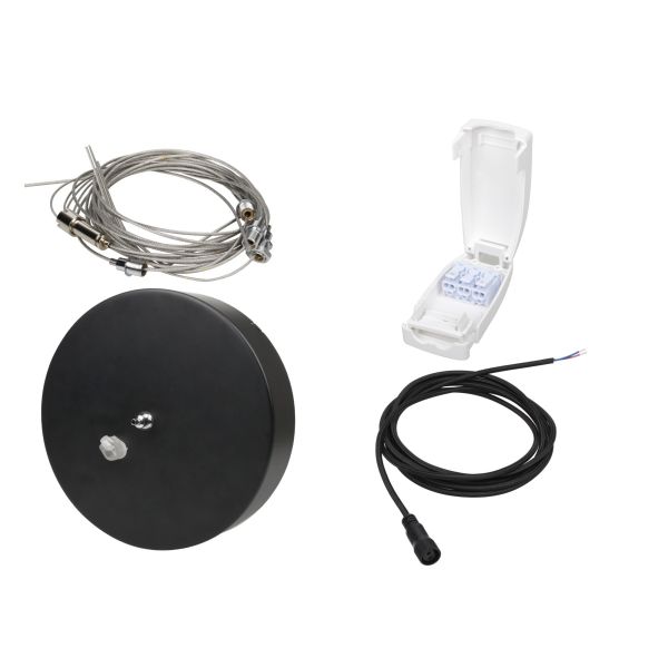 Wire Kit som er beregnet for justerbar takoppheng av plafond RING 36/600 fra Aneta Lighting. Wiren har en lengde på 5 m. Hurtigkobling til RING 36/600-plafond, inneholder tekstilkabler og tilhørende koblingsboks for å opprettholde klasse II. Tilgjengelig i fargene hvit og svart.