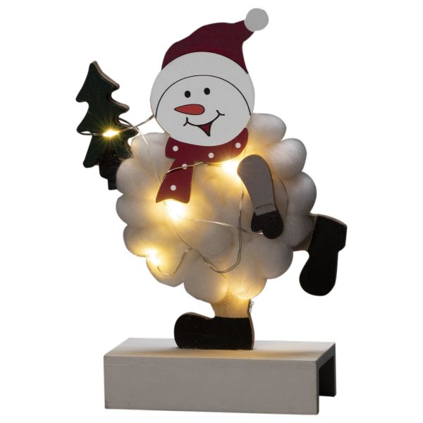 Konstsmide 3268-210 er en snømann tre og bomull, hvit, med 6 varmhvite lysdioder. 2xAA. Timer på 6 timer.