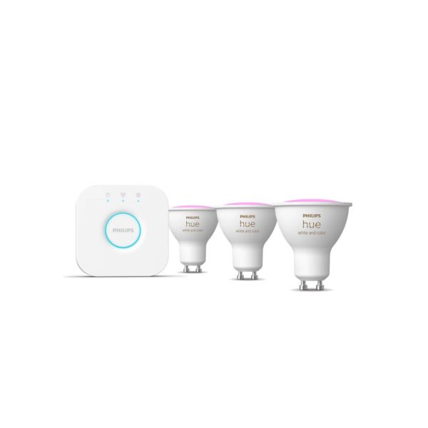 Dette Philips Hue White and Color Ambiance startsettet inneholder tre lyskilder med GU10-sokkel og en Philips Hue Bridge for maksimal kontroll over systemet. Kategoriens White and Color Ambiance gir deg tilgang til over 16 millioner nyanser av farget belysning å bytte mellom når du ønsker. Opplev hvordan belysning tar neste steg innen sammenkobling, smartstyring og smarthus-integrasjon.