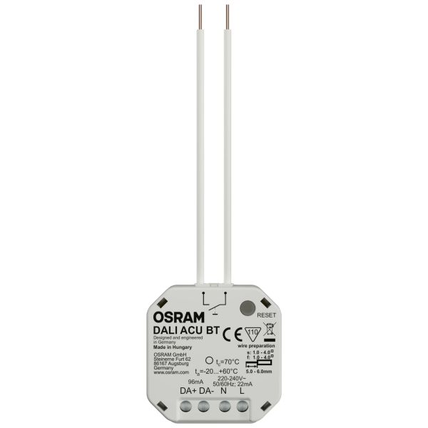 Kontrollenhet DALI ACU BT tilbyr enkel lysstyring og bytte mellom hvitt lys og Tunable White (TW), lagring av lysscener og manuell overstyring når som helst via en smarttelefon i kombinasjon med ON/OFF eller lysstyring med standard trykknapper. Kan kombineres med OSRAM DALI tilstedeværelses- og bevegelsessensorer. Opptil 32 elektroniske drivere kan enkelt kobles til en enhet. Gratis app for iOS og Android Perfekt for bruk i klasserom, kontorer, konferanserom og innganger.