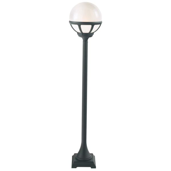 Stolpelykt med opalhvit polykarbonatkule, E27-sokkel, IP54-klassifisering og effekt på 46 W. Firkantet fot, 16,5 cm. Avstanden mellom bolthullene er 9 cm.