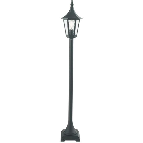 Klassisk stolpe med E27-sokkel. Armatur og stolpe i støpt aluminium og glass i polykarbonat. Har firkantet sokkel, 16,5 cm. Avstanden mellom de to bolthullene er 9 cm.