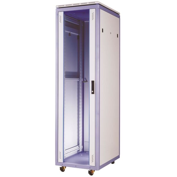 Eurolan gulvskap er beregnet på aktivt og passivt nettverksutstyr i bredbånds- eller kontornett. Grounding kit og levelling legs inngår. Maks. belastning: 600 kg Fremre dør: Tonet glass med metallramme eller helt i metall, begge med låsefunksjon. Den flyttbare døren kan åpnes både til venstre og høyre og kan lett endres ut fra hvilken retning man foretrekker. Bakre dør: Metall, med låsefunksjon.