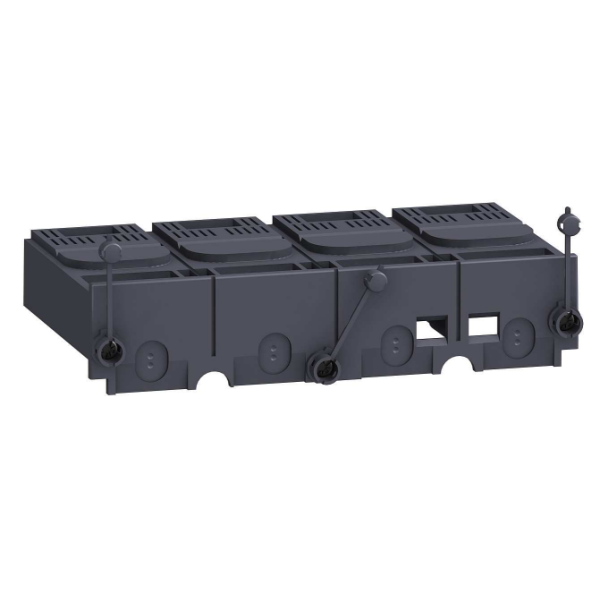 - Den øvre delen er utstyrt med forskyvbart gitter med brytemerking for nøyaktig tilpasning til kabler eller isolerte samleskinner. Den bakre delen er fullstendig adskilt fra tilkoblingsområdet. Delvis utskårne kvadrater kan fjernes for å kunne tilpasse enhver type tilkobling med kabelsko eller kobberskinner.