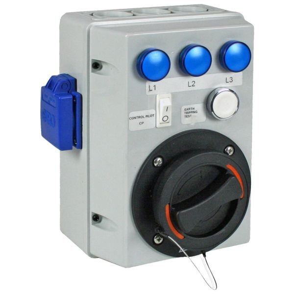 Testutstyr med 3-fase Type 2-uttak for ladestolpe LS3. Utstyrt med bryter for å kunne velge 16A eller 32A avhengig av hvilken strøm ladestasjonen er laget for.