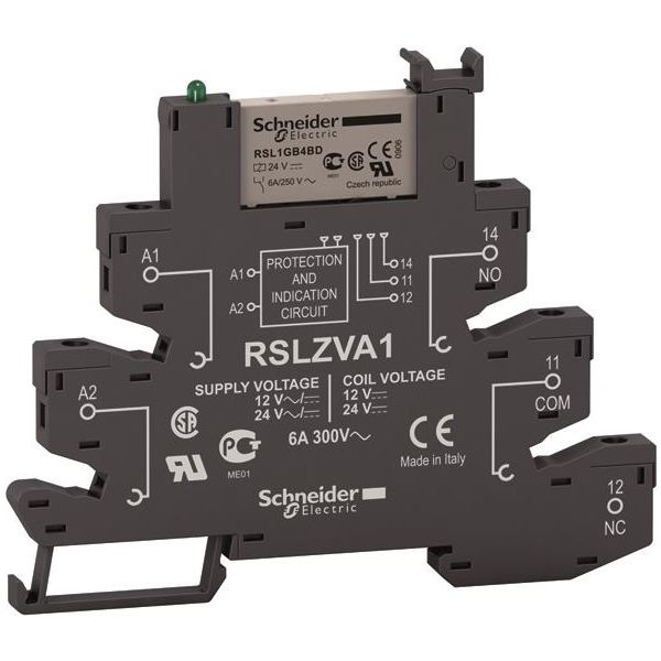 Relé og sokkel i slank utførelse. Med én vekslende kontakt, for skrutilkobling, IP40-klassifisert.