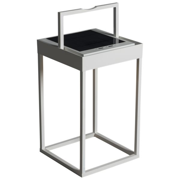 Art.nr: 3096150En hvit solcellelampe i aluminium for utendørs bruk. Lader med solceller men fungerer også med USB.