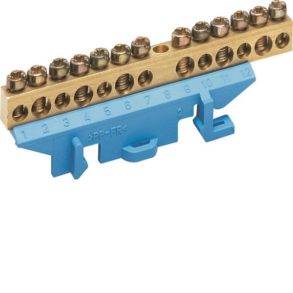 Art.nr: 3028394Messingklemmer for N-tilkobling med sokkel for DIN-montering. Har seks 16 mm²-tilkoblinger og sju tilkoblinger på 10 mm².