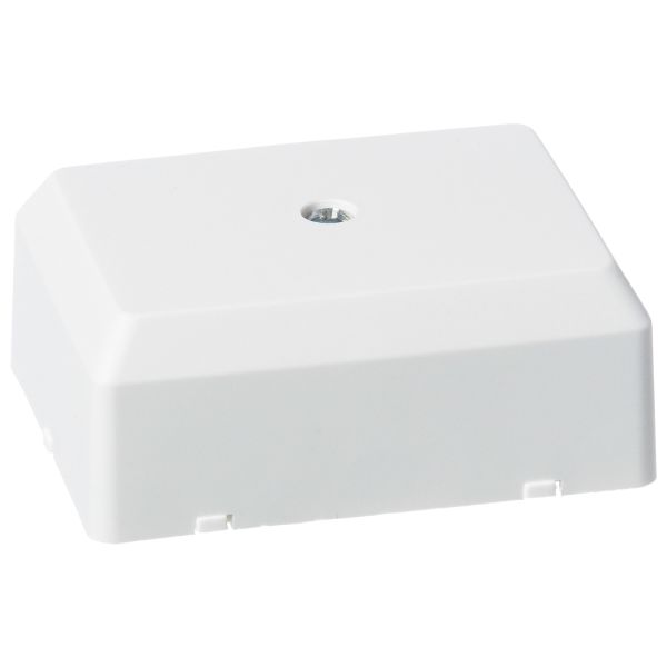 Koblingsboks av termoplast. Bunnplaten er utstyrt med støttetapper som forenkler montering tett inntil lister og mot tak.
