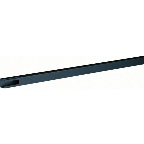 En svart kabellist/​matarkanal for utenpåliggende kabellegging. Komplett med underdel, lokk og nødvendig antall klammer.