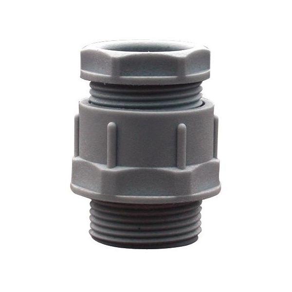 Kabelgjennomføring av grå glassfiberforsterket polyamid iht. RAL 7035. Utstyrt med pakning av nitrilgummi iht. DIN 46 320.