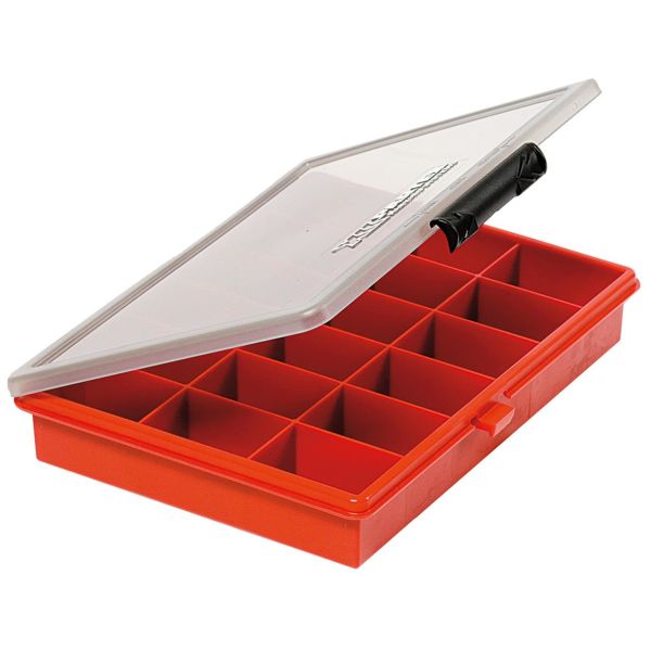 Art.nr: 3095603Tom sortimentsboks i slagfast plast. Med 18 rom.