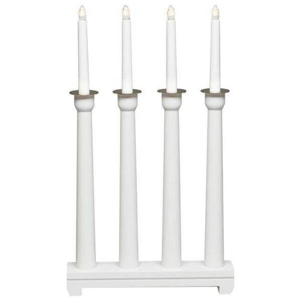 Konstsmide 3975-210 er en elektrisk lysestake med 4 lyspunkter, laget av tre i hvitt. 230V/IP20.