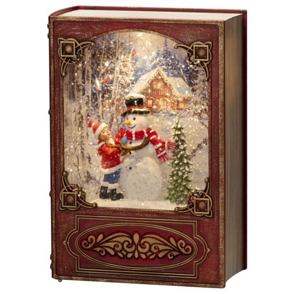 Konstsmide 4273-550 er en vannfylt lykt, rød bok med snømann. Timer 5t. 3xAA og USB.