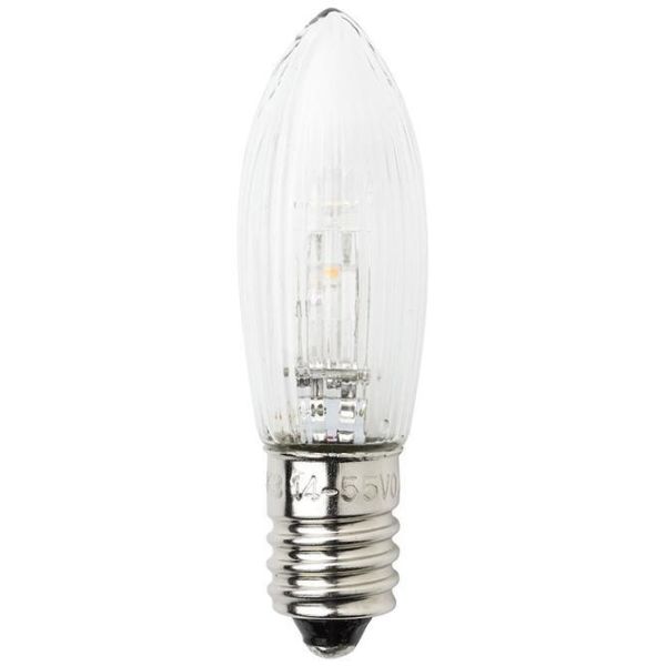 Konstsmide 5042-130 er en reservelampe til dekorasjonsbelysning, sokkel E10. Klar lampe med varmhvitt skinn. Spenning 14–55 V. Leveres som 3-pakning.