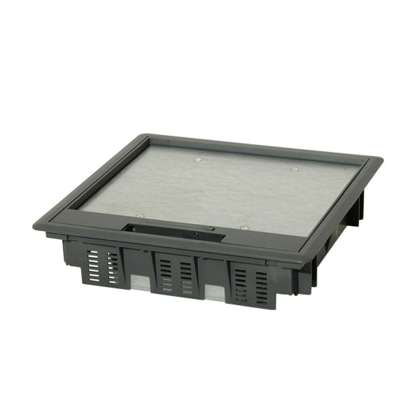Art.nr: 3105467En kvadratisk gulvboks i grå plast (polyamid) for tørre innemiljøer, med plass til opptil 12 enheter. Maks belastning på lokket er 200 kg.