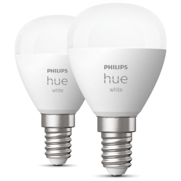 Philips Hue 929002440604 Lyskilde. Denne pakken inneholder to 5,7 W Philips Hue White LED-lyskilder (tilsvarer 40 W) med E14-sokkel, en serie smarte lamper som lyser i standard fargetemperatur 2700 kelvin, og som du kan dimme og styre uten ekstra elektriske installasjoner. Med Philips Hue tar belysningen neste steg innen sammenkobling og integrasjon i det smarte hjemmet. Det er et helhetlig økosystem som lar deg ha smart belysning i alle livets situasjoner. Fra å gi deg full og fleksibel kontroll over hele systemet til å koble det sammen med andre smarthjem-produkter for å bygge et smart system i boligen som er der for deg gjennom hele dagen.