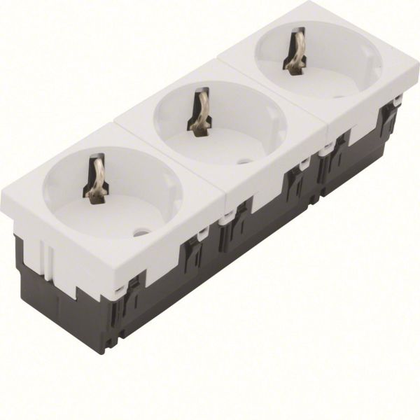 Art.nr: 3105510Et hvitt 3-veis uttak til Hager gulvbokser, 230 V, 33° vinklet brønn, for 45x45 mm modul.