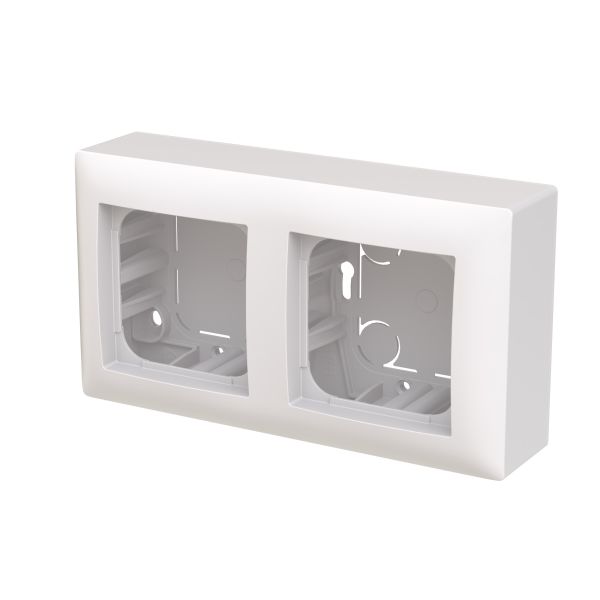 Utenpåliggende monteringsboks SAGA for et 2-roms apparat med 85 mm bredde. Denne boksen er lav, med en total høyde på 43 mm. Den er egnet for enheter med maksimal installasjonsdybde på 26 mm. Enheten består av bunnplate og overdel. Bi-sirkulær plast brukes i bunn- og senterplaten.