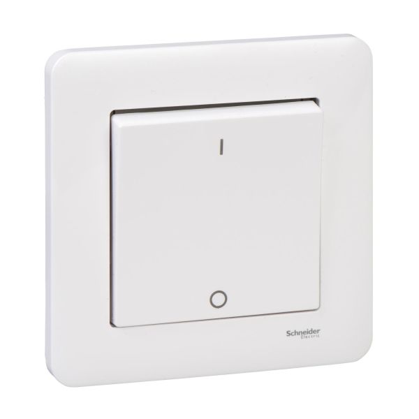 Schneider Electric-bryter Exxact leveres komplett i blisterpakning. Produktet har hvit, blank overflate og er beregnet for innfelt montering; enhetens mål er 87 mm i bredde og høyde samt 33 mm i dybde, med en innbyggingsdybde på 15 mm. Huset består av halogenfri termoplast, og apparatet har kapslingsgrad IP20; den festes med klo og skrue og tilkobles med skruklemmer. Bryteren er 2‑polet med én vippe, uten lys og uten merke-/etikettfelt, og er konstruert for merkespennning 250 V og merkestrøm 16 A, med bryteevne for lysrør på 16 AX.