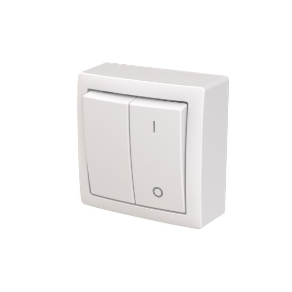 2+1-polet bryter SAGA for utenpåliggende montering med skruløse klemmer. En av vippebryterne er merket med I/0. Klemmene er beregnet for maks. to solide eller stive ledere. Inkludert bryterinnsats, vippe, utenpåliggende ramme og bunn. Bi-sirkulær plast brukes i bunnplate, senterplate og vippe.