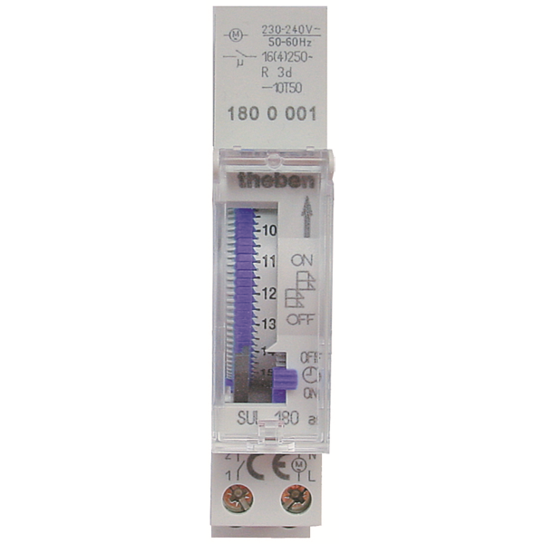 Theben SUL180A er et koblingsur som bare bygger 1 modul, beregnet på montering på DIN-skinne i normkapsling alternativt utenpåliggende montering i separat berøringsbeskyttet kappe.SUL 180A har et utbyttbart batteri med ca tre døgns gangreservetid.Omkobler for permanent av eller på og for den automatiske posisjonen etter innstilt tidsintervall.