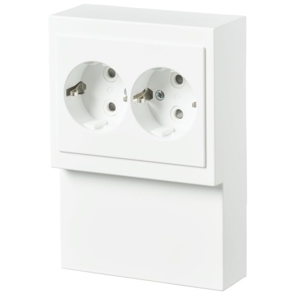 Stikkontakt med 2-veis horisontal Schuko stikkontakt. Beskyttelsesdekselet er integrert i innsatsen. Skruefri tilkobling med plass til 4 kabler per tilkobling. For EK- eller FK-kabler opptil 2,5 mm2. Det er mulig å låse innkommende kabler med buntebånd, da det er flere spor å velge mellom.
