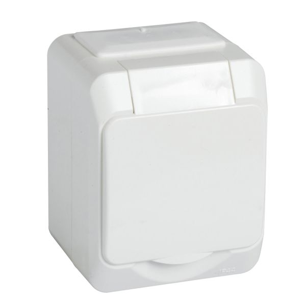 Schneider Electric vegguttak er et jordet, 1-veis utenpåliggende vegguttak for påveggsmontasje med kapslingsgrad IP44. Uttaket tilsvarer CEE 7/3 (Type F) og er utført i polarhvit farge (RAL 9010); det leveres komplett i blisterforpakning. Bunninnsatsen med komplett hus er produsert i halogenfri termoplast med blank overflate og ubehandlet overflatefinish, og produktet har slagfasthet IK07. Tilkobling skjer via skruklemmer og jording via jordblekk; feste skjer med skruer, og konstruksjonen muliggjør isolert montering. Produktet har hengslet lokk, er barnesikret (petsikret) og er utstyrt med gjennomførings-/gjennomkoblingsfunksjon for viderekobling. Merkestrømmen er 16 A ved merkespenningen 250 V og frekvensområdet er 50–60 Hz; uttaket er av enfasetype med to runde aktive stifter. Enhetens mål er 60 mm i bredde, 75 mm i høyde og 49 mm i dybde.