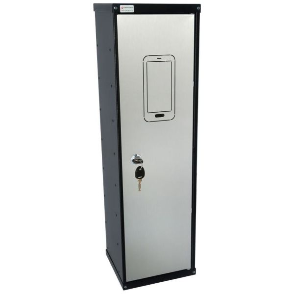 UNITEL 8 MOBILSKAP 1 LUKE er delt opp i to seksjoner, én der laderne plasseres og én med hyller der telefonene plasseres. Ledningen går fra laderen til telefonen i et spor, noe som gjør at den er lett tilgjengelig for brukeren. Produseres i 2 mm metall og lakkeres i alt unntatt luken med svart strukturmaling. Luken er produsert i rustfritt stål. Leveres med to nøkler og hvis flere skap bestilles er det mulig med likelåning eller hovednøkkelsystem.