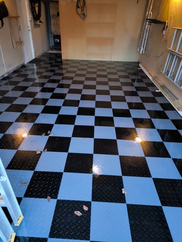 Det är högljutt och klapprigt när man går på det. Skulle nog behöva foam under. Men vem lägger det i garaget? Den blanka ytan är repkänslig.